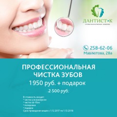 При проведении комплексной процедуры профессиональной гигиены (скейлинг, аэр-флоу, фторирование минералами) в подарок от клиники Дантист-К Вы получаете полный набор средств гигиены Splat, а также обучение гигиене и индивидуальные рекомендации по уходу за у…