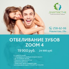 *В стоимость входит: отбеливание на новейшем аппарате Zoom 4 все этапы, все включено. Приём ведут врачи-стоматологи с опытом более 20 лет, в том…